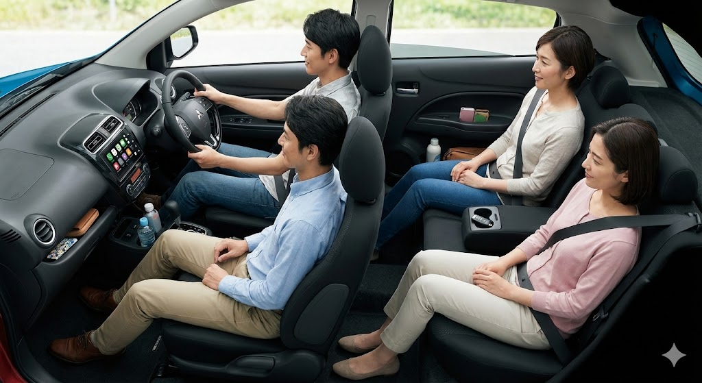 Kabin Mirage meski kecil tetap nyaman untuk 5 penumpang, dirancang untuk penggunaan harian di kota.