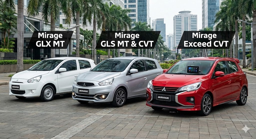 Mirage tersedia dalam beberapa varian, menyesuaikan kebutuhan pengemudi perkotaan: