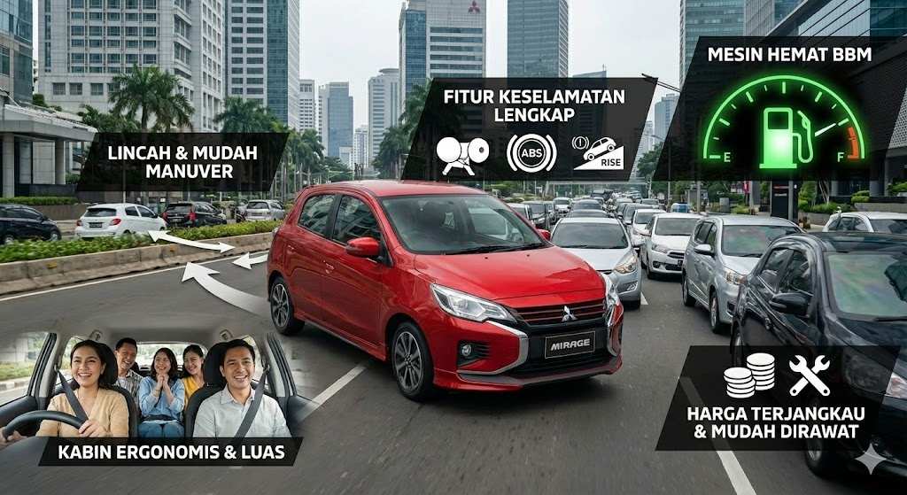 Mitsubishi Mirage adalah city car kompak yang dirancang untuk memudahkan aktivitas perkotaan. Dengan ukuran kecil, konsumsi bahan bakar hemat, dan kemampuan manuver lincah, Mirage cocok bagi pengemudi yang membutuhkan mobil praktis untuk pekerjaan sehari-hari, belanja, atau berkendara di kota yang padat.